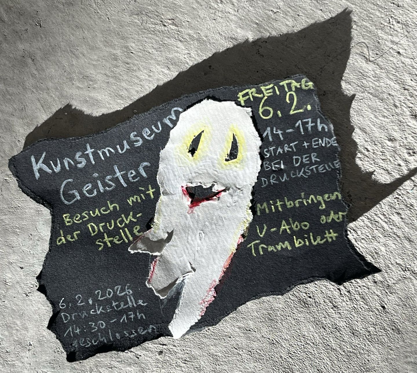 Wir starten gemeinsam in der Druckstelle und gehen spätestens um 14.30 Uhr los. Um 17.00 Uhr sind wir wieder zurück. Der Museumsbesuch ist kostenlos. Um eine kurze Anmeldung per Mail sind wir froh. Wer hat, bitte U-Abo mitbringen.