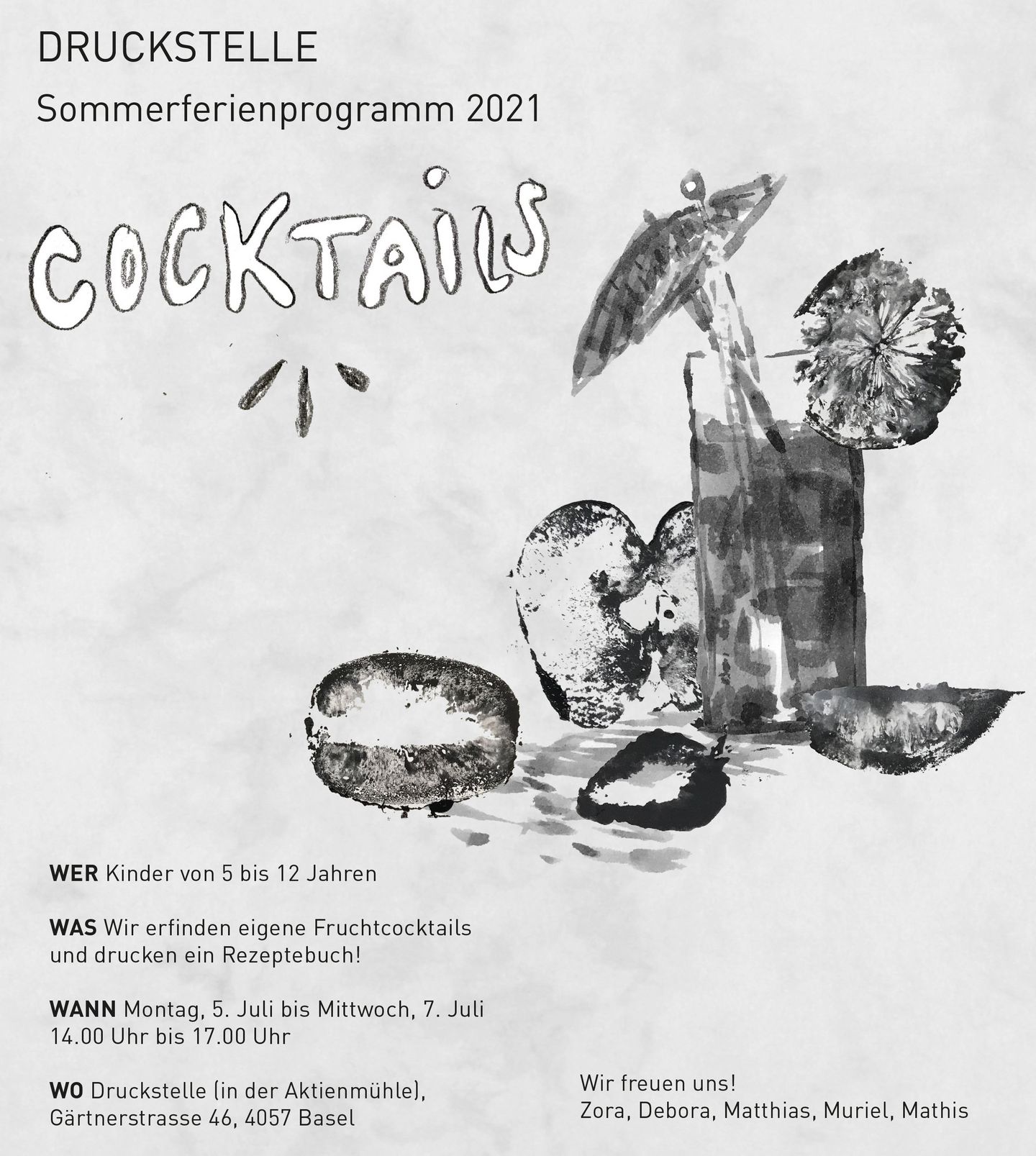 In der ersten Woche der Sommerferien veranstalten wir während dreier Tage ein Ferienprogramm. Wir erfinden eigene Fruchtcocktails und drucken ein Rezeptbuch dazu. Die dazugehörigen Illustrationen gestalten wir mit dem "Fruchtdruck"-Verfahren. Kinder von 5-12 Jahren können sich gratis anmelden - bitte benutzt dazu den angehängten Anmeldetalon. Wir freuen uns!